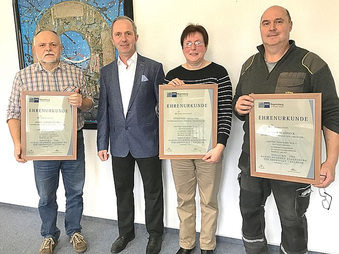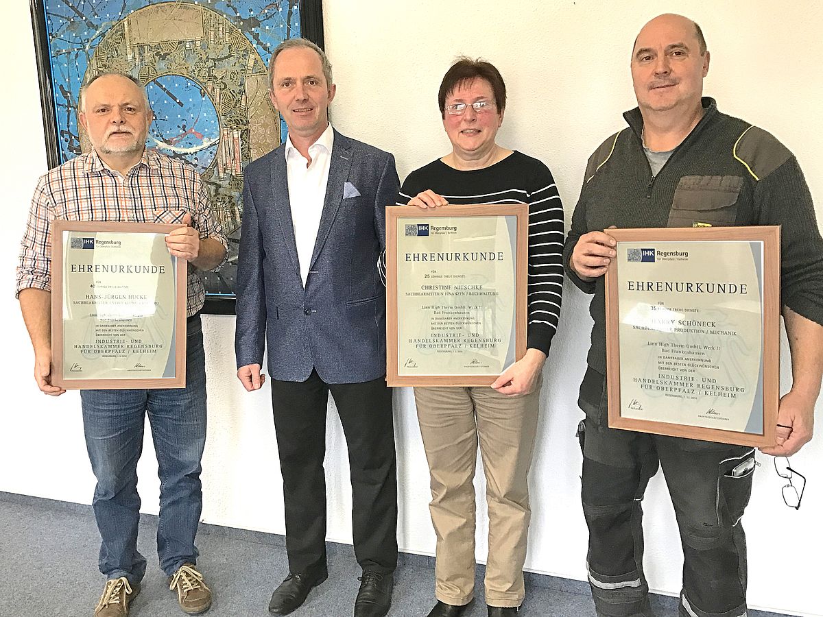 40-, 35-, und 25-jähriges Jubiläum konnte Hans-Jürgen Hucke, Harry Schöneck und Christine Nitschke bei Linn High Therm GmbH 2016 in Bad Frankenhausen feiern. Horst Linn - Geschäftsführer - ehrte Anfang 2017 die 3 Mitarbeiter, die zusammen 100 Jahre Betriebserfahrung und Fachkompetenz am Standort Bad Frankenhausen vorweisen können.